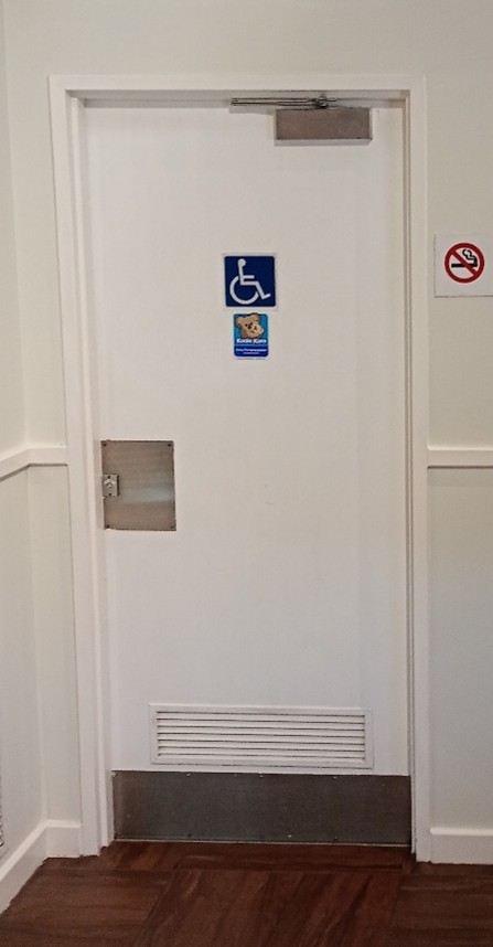 Wheelchair accessible toilet is located on the right side of the entry doors next to the gents’ toilets.