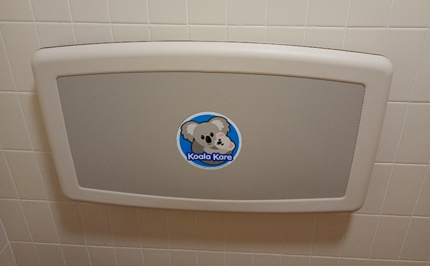 A baby change table is in the wheelchair accessible toilet, inside the building, right side of the entry doors.