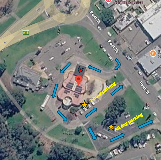 On-site parking is available. During opening hours, parking is accessible via the Hungry Jacks entry. Follow this road around the Australian Country Music Hall of Fame (indicated by the blue arrows on the map) to the carpark on the right side of the building. Three parking zones are available (two indicated by the yellow stars on map).